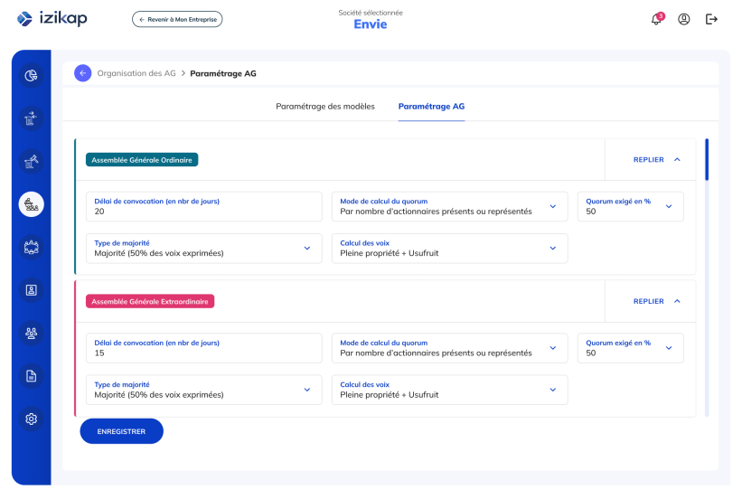 Izikap simplifie et sécurise l’organisation des AG : de la convocation à l’archivage des registres de décisions. Vous pilotez chaque étape depuis une seule interface, en garantissant à vos équipes et à vos actionnaires une parfaite traçabilité et une réelle économie de temps.