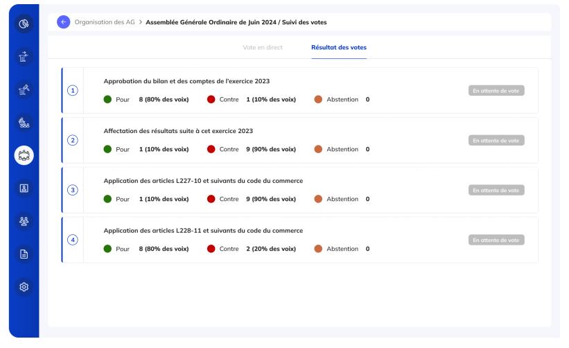 - Suivez en temps réel le quorum, les votes et les participations avec des calculs automatiques précis