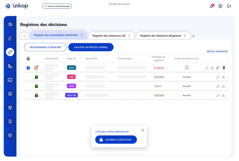 Affranchissez-vous des risques d’erreurs humaines sur la tenue des registres et du coût de leur stockage avec Izikap ! Notre solution révolutionne la gestion des registres de mouvements de titres et des procès-verbaux d’assemblées générales, en dématérialisant et automatisant un grand nombre de process.